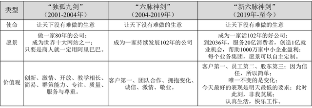 阿里巴巴的价值观从2001年的“独孤九剑”到2004年的老“六脉神剑”,再到2019年的“新六脉神剑”历经三个版本,迭代过程紧紧围绕战略与组织的变迁,准确反映使命与愿景的指向。
